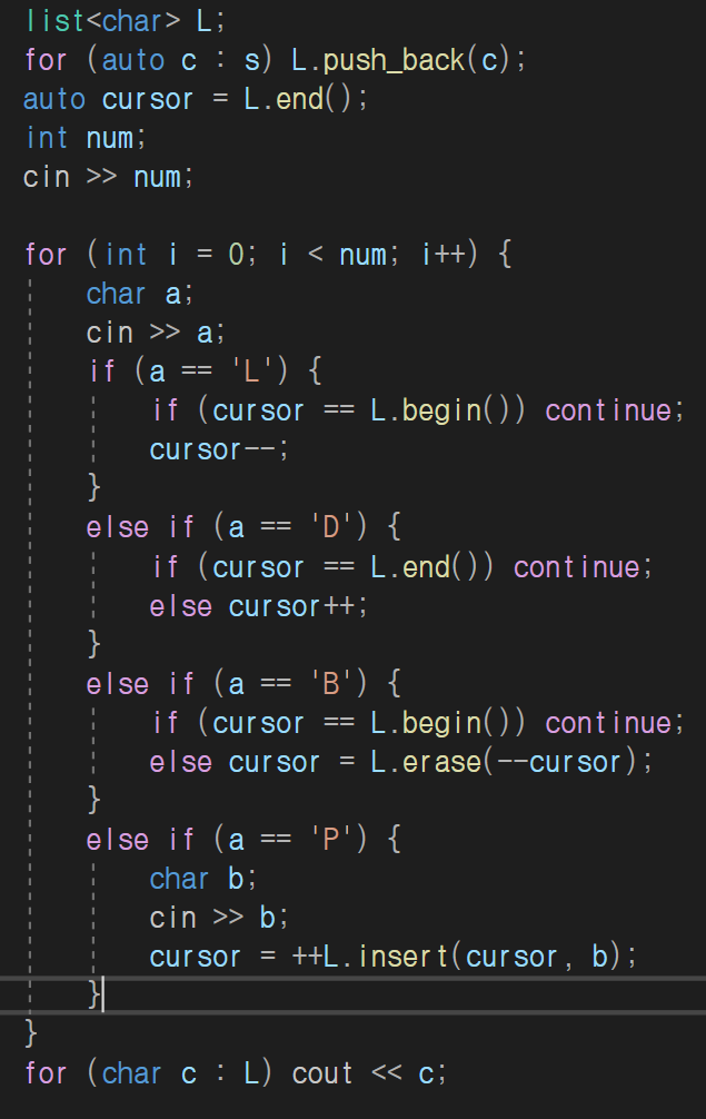 초기에 편집기에 입력되어 있는 문자열이 주어지고, 그 이후 입력한 명령어가 차례로 주어졌을 때, 모든 명령어를 수행하고 난 후 편집기에 입력되어 있는 문자열을 구하는 프로그램을 작성하시오. 단, 명령어가 수행되기 전에 커서는 문장의 맨 뒤에 위치하고 있다고 한다.
