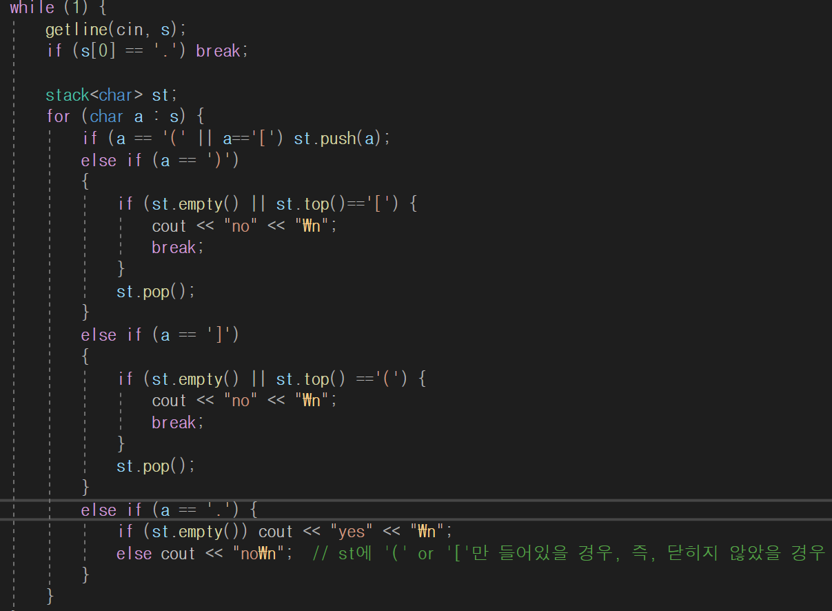 - 닫힘 괄호가 들어올 때, 현재 스택의 top()이 해당 괄호랑 맞는 쌍인지 판단하고, 맞으면 pop으로 지워주고, 아니면 "no"를 출력한다. 또한, 스택이 비어있는 상태(empty)일 때에도 "no" 출력.