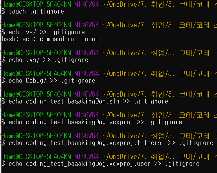 아래와 같이 오른쪽 파일들에서 제외시키고 싶은 것들을 echo 명령어로 .gitignore에 추가!
