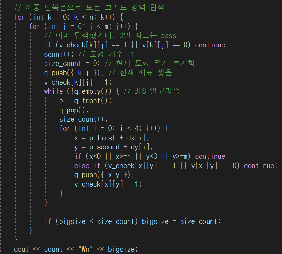 - BFS 알고리즘을 기반으로 모든 그리드의 좌표들에서 도형을 찾으면 됨