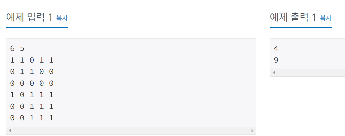 - 입력 그리드와 1과 0으로 이루어진 값들을 받고, 1로 이어진 도형 개수와 최대 크기를 출력하는 문제.