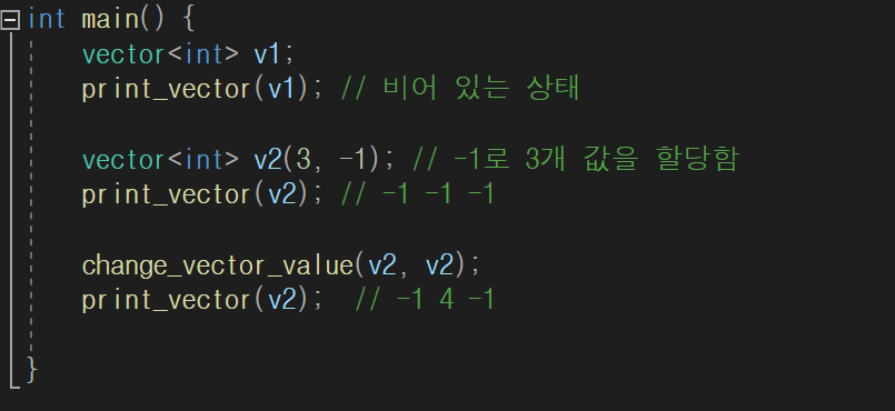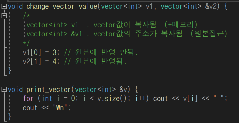 - vector를 함수의 인자로 넘겨줄 시, change_vector_value()에서 처럼 복사할건지, 주소만 넘겨줄 건지 생각해야됨