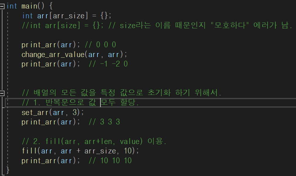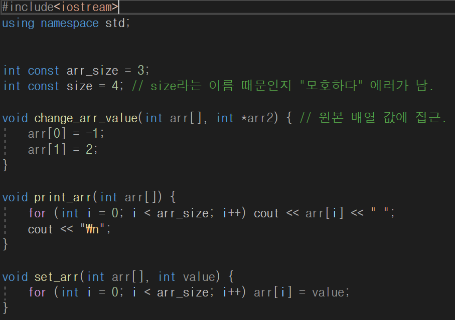 - 배열 선언시, const로 미리 지정된 size만큼 선언합니다. 여기서 "size"라는 이름으로는 할당이 안됨.