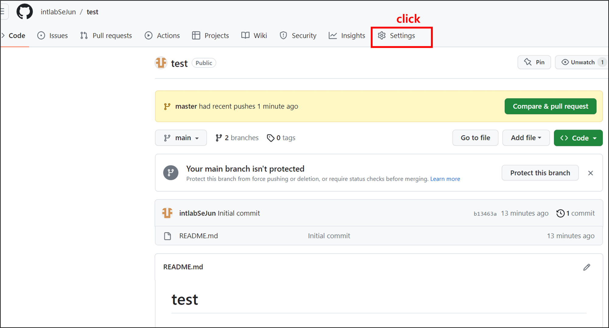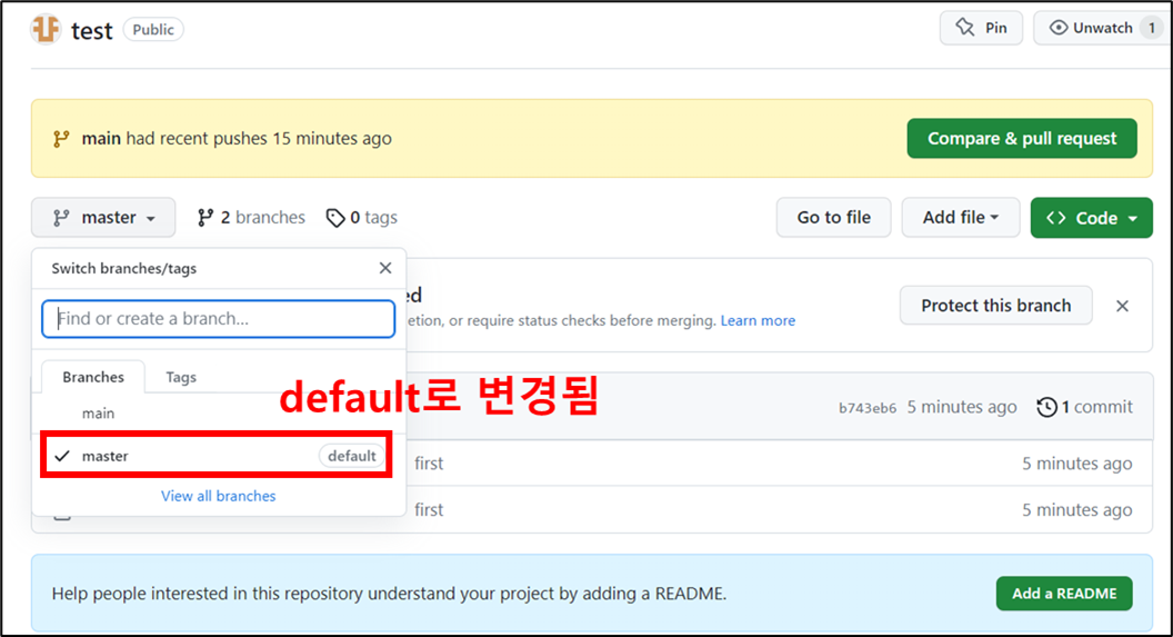 # 만약에 이미 있는 2개의 branch에서 main branch만 제거하고, master branch만 남기고 싶을 경우에는 다음과 같이 수행.