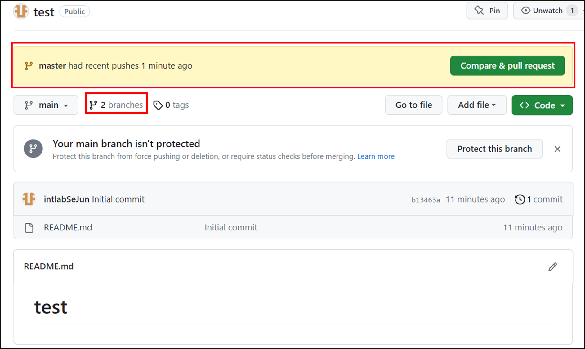 원격 저장소(git)에 로컬저장소(내컴퓨터)의 파일을 연동했는데, branch가 2개 생기는 상황