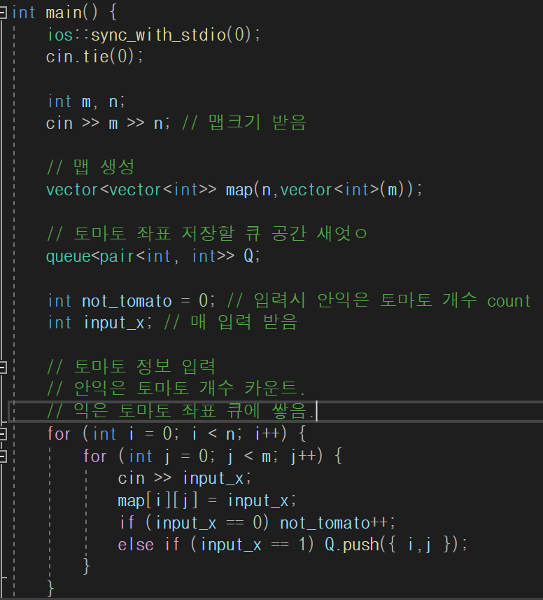 추후에 익혀진 토마토의 개수와 일치하면 모두 익은 것임. - 익은 토마토 좌표는 큐에 쌓아준다.