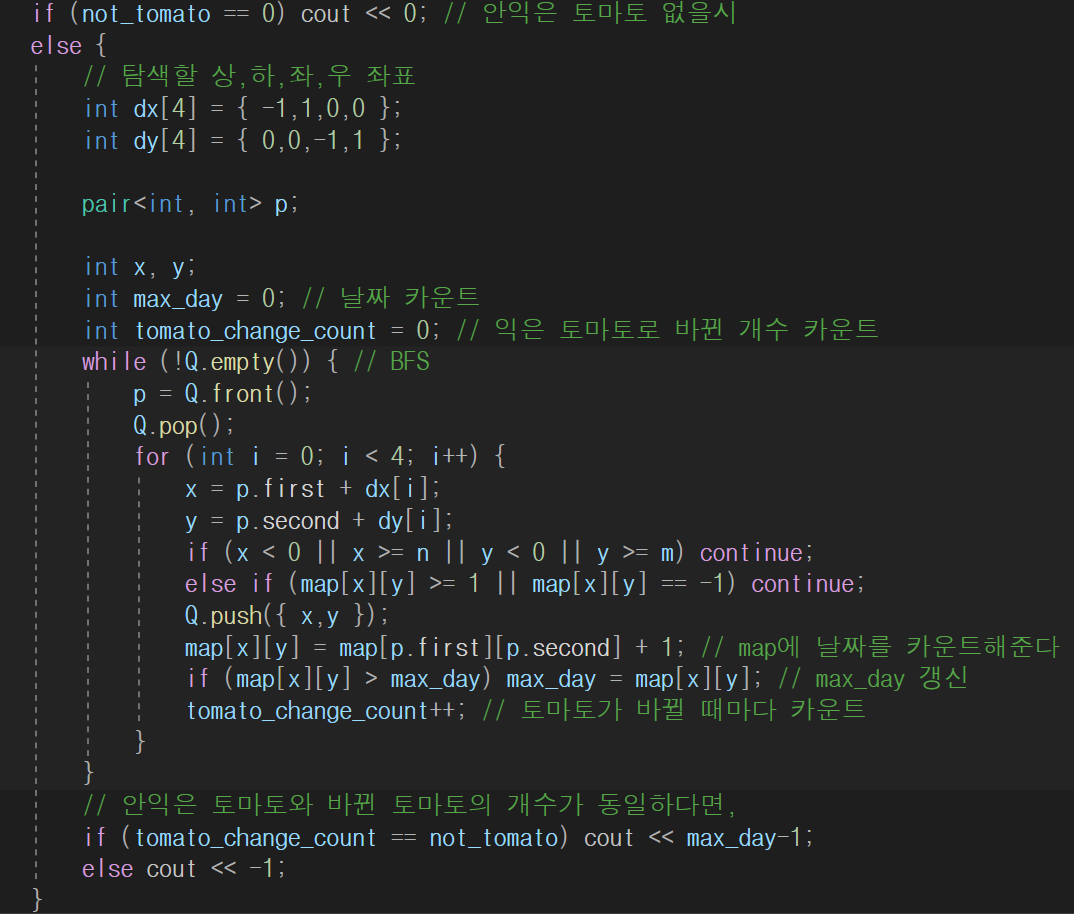 - BFS를 이용하여 map에 대한 정보를 업데이트 하는데, 익은 토마토의 인접한 좌표들에서 안익은 토마토가 익었을 때 이동 거리만큼 map을 업데이트 해준다. 그리고 그때마다 max_day라는 변수에 최소 일수를 갱신.
