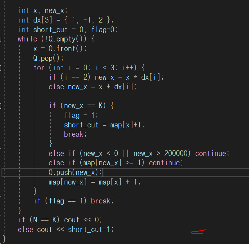 - 1차원 벡터(배열)의 map을 만들고, 수빈이의 시작지점에 1의 값을 넣고, 다음 이동 배열 값에 현재 위치의 값+1을 해주며 확산한다.