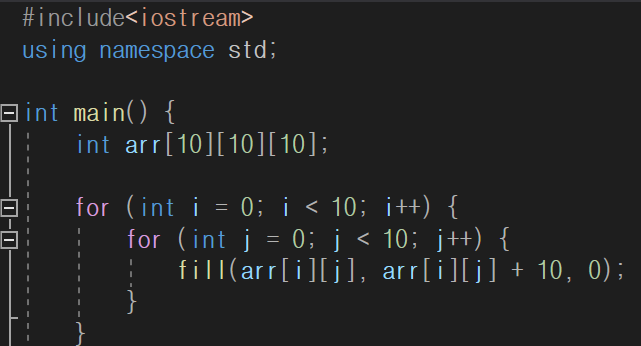 - fill(arr[i], arr[i] + column, value) : i번째 행마다 column까지의 원소에 value를 할당함