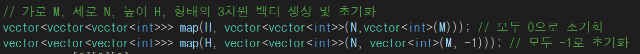 vector안에 또 다른 벡터를 선언하고 이를 높이(H)만큼 선언 - 초기값은 0으로 할당되며, 원할시 값을 할당할 수 있음.