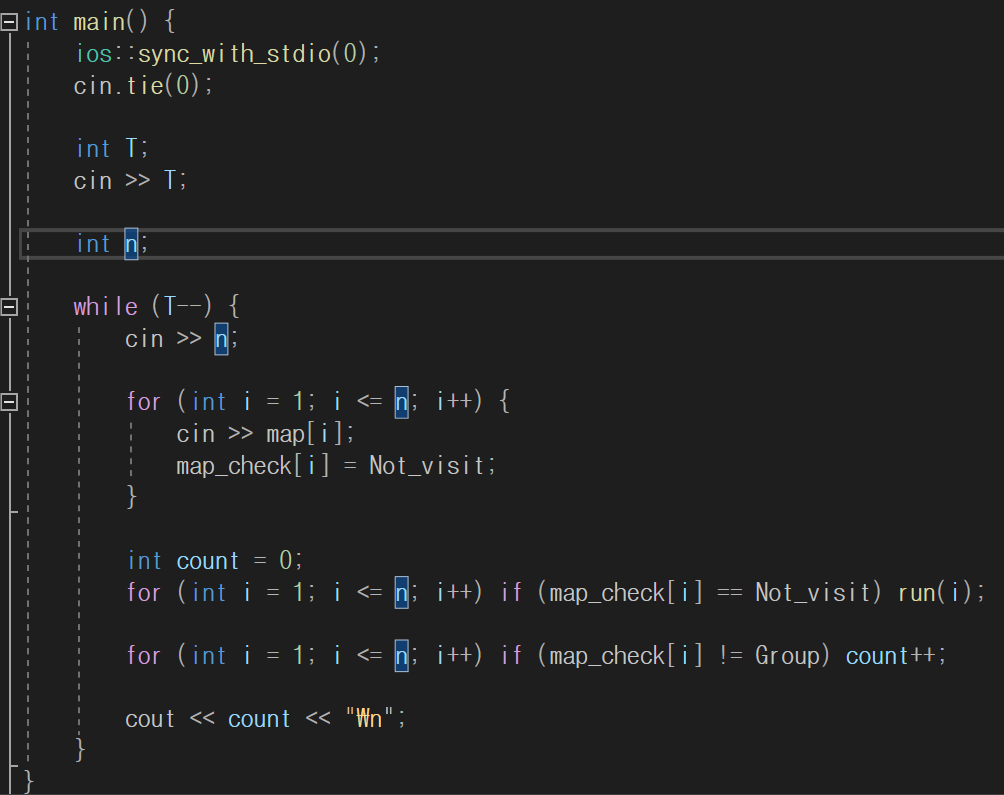 - n번째에서 표시를 마치고, n+1번째에서 탐색을 할 시, 1~n번째에서 표시한 사람을 가르킨다면 이 또한 팀을 이루지 못한다고 할 수 있습니다. 이미 앞에서는 구분이 끝나있기 때문에요. 팀을 이룬 그룹에는 더 이상 들어갈 자리가 없습니다(순환이 안되니). 팀을 이루지 못하는 사람도 마찬가지입니다.