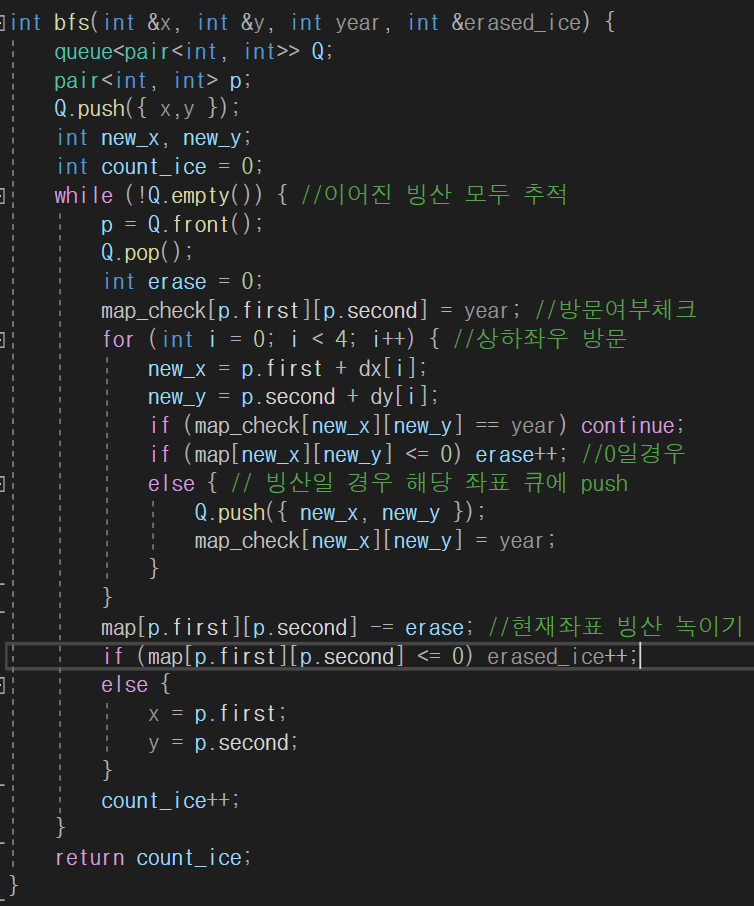 1) year이 지날 때마다 map에 있는 빙산들의 경로를 BFS로 반복적으로 탐색해야 하고, 그 과정에서 경로로 지나가는 빙산의 개수(count_ice)와 빙산이 녹아 없어지는 개수(erased_ice)를 세어줍니다. - 빙산의 개수(count_ice)는 빙산이 2개 이상으로 분리되었는지 체크를 위해, 맨 처음 빙산의 개수인(total_ice)와 동일한지 확인하고, 동일하지 않다면 빙산이 끊긴 것으로 반복문을 종료, year를 출력합니다.