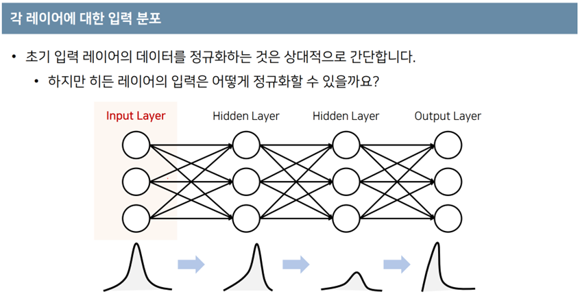 - 위의 그림에서 입력은 정규화(or표준화)를 통해 비슷한 입력분포가 들어오지만 다음 히든 레이어부터는 정규화를 해주지 않아 학습 스탭마다 다른 분포가 들어올 수 있고, 이것이 모델의 수렴속도를 제한한다는 주장이였다.