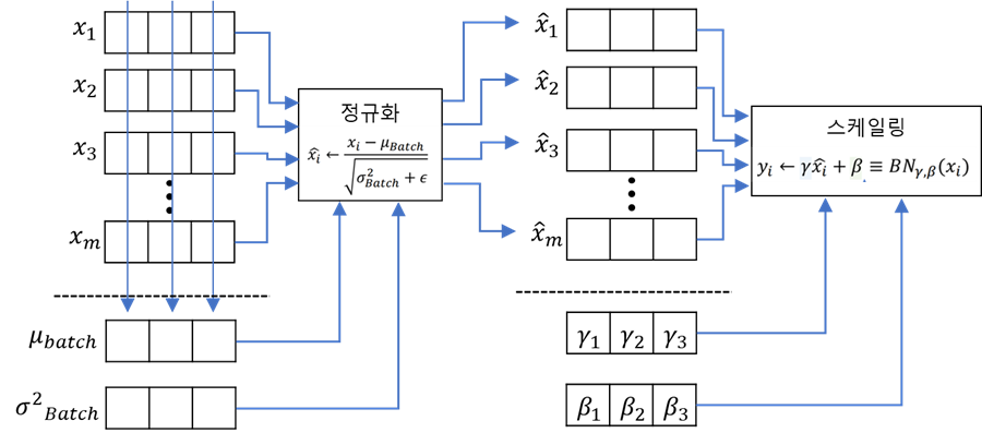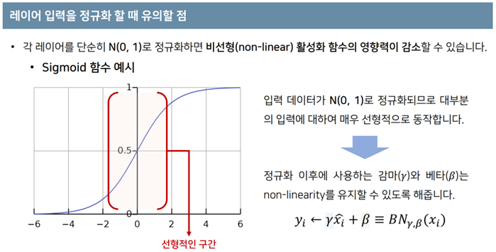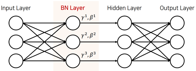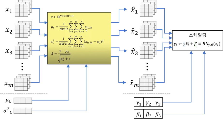 - 학습 가능한 파라미터 감마와 배타로 각 채널마다 스케일링한다.