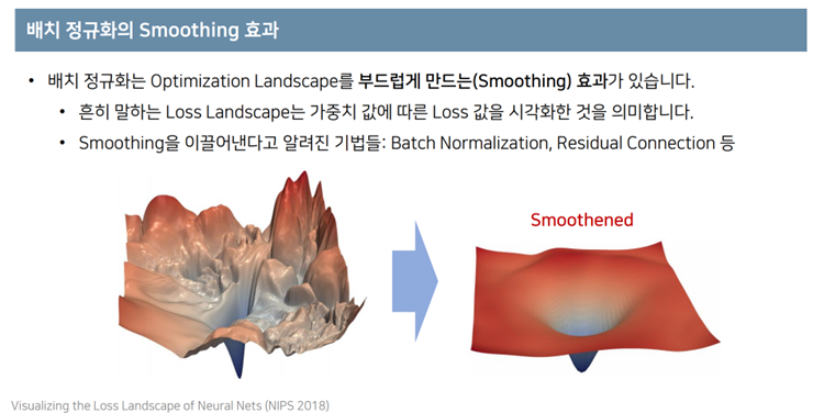 - smoothing하다는 말은 loss값의 변동이 작고 gradient의 크기또한 작다는 말. 그러므로 매스탭마다 조금씩 가중치를 업데이트 하므로 부드로운 landscape를 형성할 수 있다.