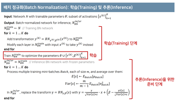 - 추론에서는 mini-batch로 얼마나 들어올지도 모르기 때문에, 조금 다르게 BN을 수행한다.