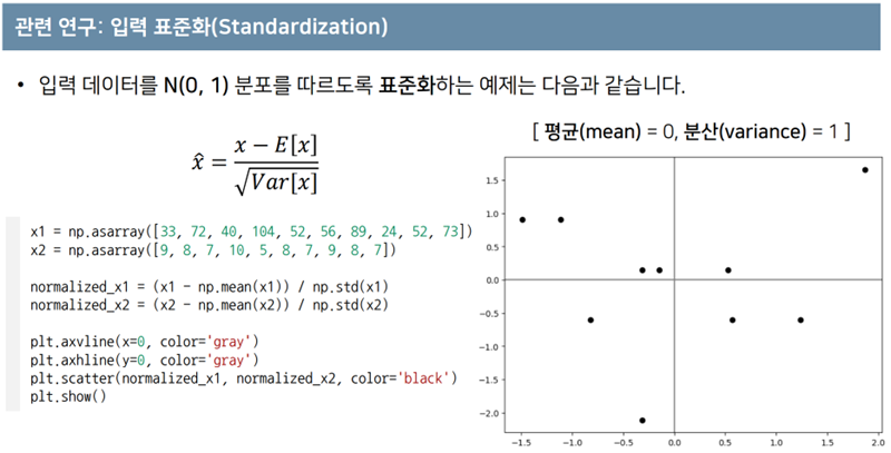 - 일정 scale의 범위로 정규화(normalization) 하는 것과 다르게, 표준화(Standardization)은 입력 데이터를 평균=0, 분산=1인 정규분포를 따르도록 한다.