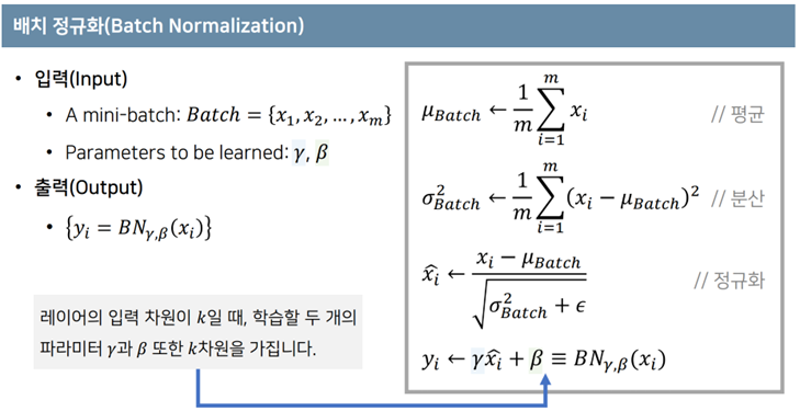 - 입력에 대해서 mini-batch에서의 각 차원에 평균과 분산을 구하고 이를 정규화(표준화와 비슷하다)
