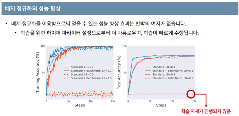 - 특히, 왼쪽 그림의 주황색 점 그래프에서 BN을 사용하지 않고 큰 lr을 수행할 경우 학습이 안되는 모습