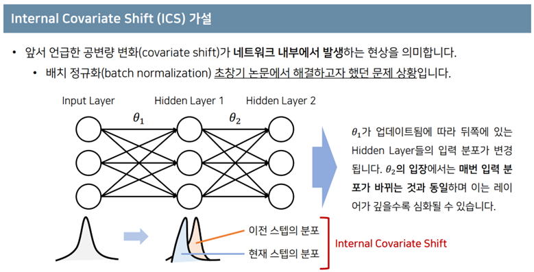 - 모델의 입력에서만 공변량 변화가 발생하는 것이 아닌, 모델의 내부에서의 각 feature들에 대해서도 공변량 변화가 발생할 수 있다는 가정. 이게, 내부적인 공변량 변화(Internal Covariate Shift)라고 한다.