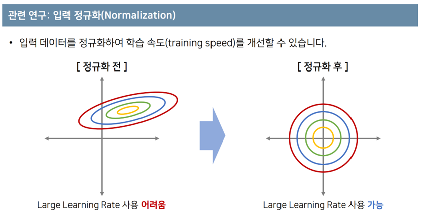 - [정규화 전]의 데이터에서는 가로축에는 variance가 크고, 세로축에는 variance가 작다. 이러한 데이터를 가지고 학습을 진행하면, 큰 learning rate를 사용하기 어려운데, 가중치 값이 많이 바뀐다면 세로축은 feature 값들의 많은 변화가 있을 수 있지만, 가로축은 변화가 거의 없을 수 있음. 따라서, [정규화 후]의 그림처럼 입력 데이터를 각각의 축에 대해서 학습에 수월한 데이터 분포를 가질 수 있도록 한다. 이 때, 상대적을 더 큰 learning rate를 사용 가능하므로 학습 수렴속도가 빨라진다는 장점이 있다.