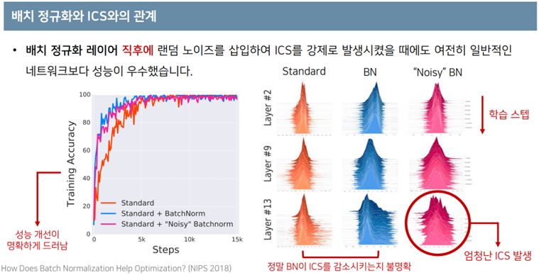 - 후속 연구에 의해 BN의 효과와 ICS의 감소는 큰 상관이 없다는 주장이 제기되었다. 꼭, ICS가 감소하지 않더라도 성능향상이 가능하다는 것을 증명한다.