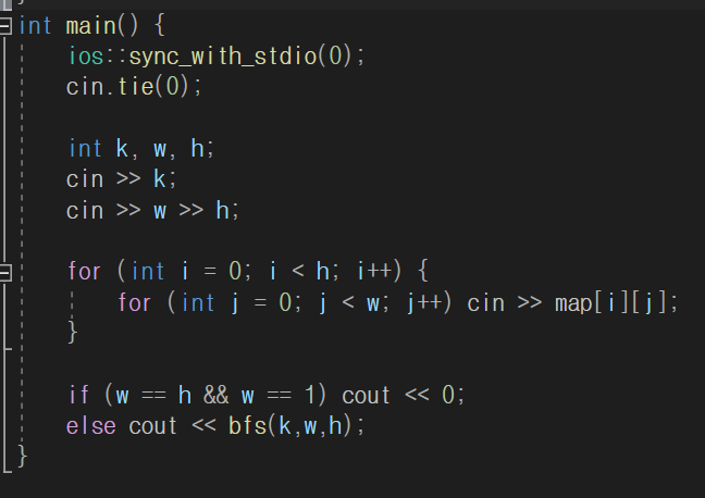첫째 줄에 정수 K가 주어진다. 둘째 줄에 격자판의 가로길이 W, 세로길이 H가 주어진다. 그 다음 H줄에 걸쳐 W개의 숫자가 주어지는데, 0은 아무것도 없는 평지, 1은 장애물을 뜻한다. 장애물이 있는 곳으로는 이동할 수 없다. 시작점과 도착점은 항상 평지이다. W와 H는 1이상 200이하의 자연수이고, K는 0이상 30이하의 정수이다.