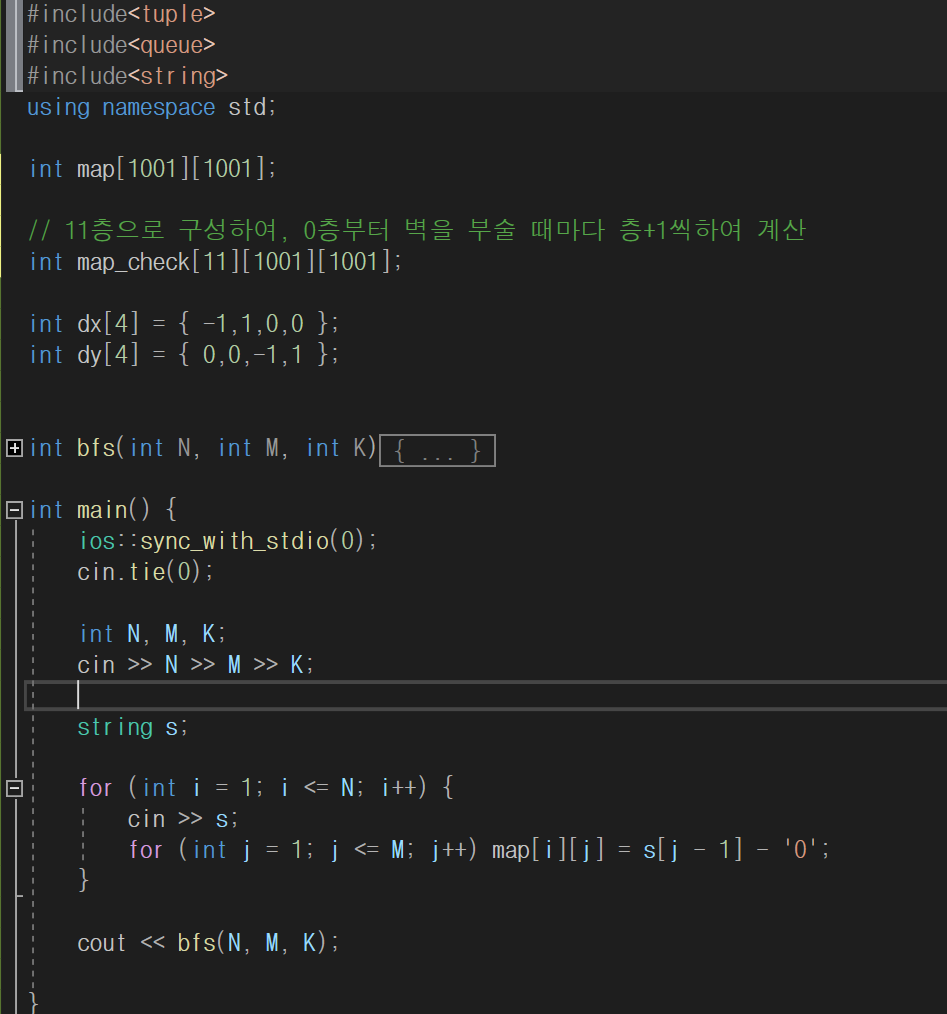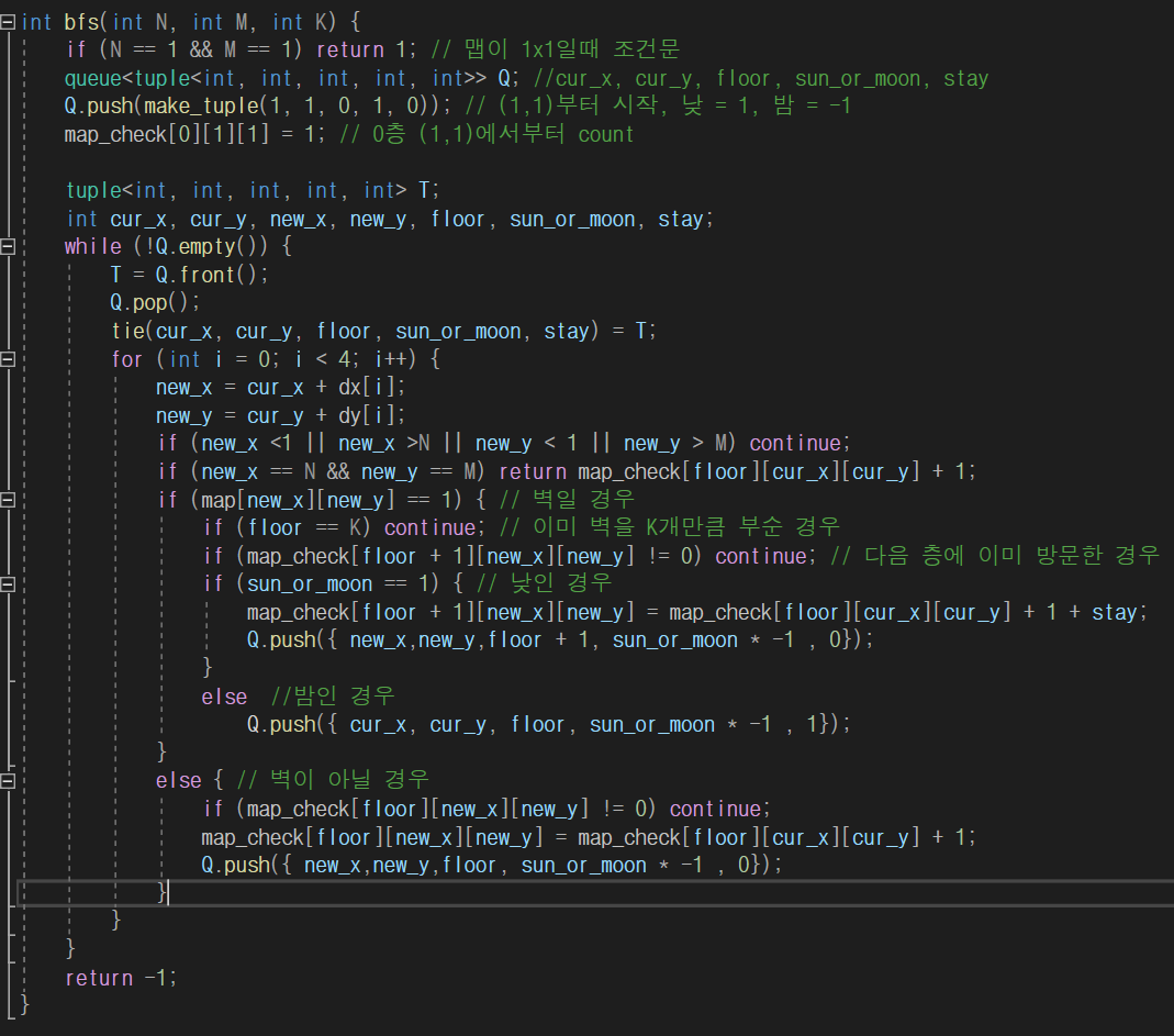 ***주의 : 만약 stay를 사용하지 않고 현재 좌표의 map_check에 ++를 해준다면, 벽 이외에 양,옆으로 이동시에 ++해준 값이 더해져 재대로 된 최단거리를 구할 수 없게 됩니다. - 낮과 밤은 각각 +1, -1로 설정하였으며, 이를 통제하기 위해 다음 좌표 이동시에 sun_or_mood * -1을 해주었습니다.
