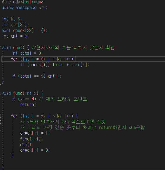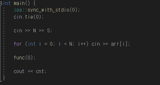 N개의 정수로 이루어진 수열이 있을 때, 크기가 양수인 부분수열 중에서 그 수열의 원소를 다 더한 값이 S가 되는 경우의 수를 구하는 프로그램을 작성하시오.
