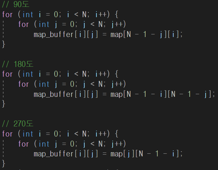 행렬을 그려보고, 받을 행렬의 위치를 기준으로, 회전으로 넣을 행렬의 인덱스 변화를 살펴보면서 세팅하면 편하다.